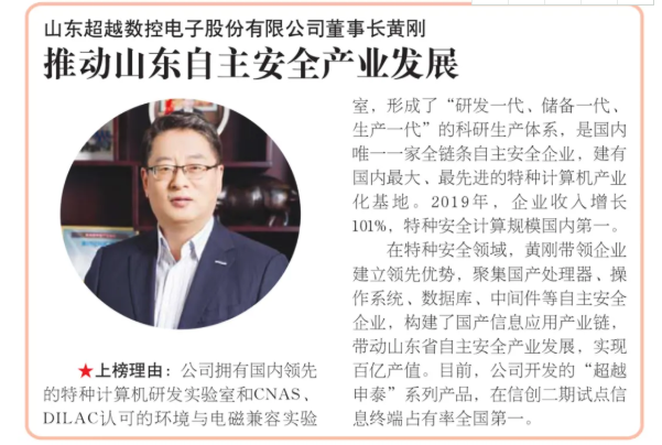 近日,山東第一財經媒體、大眾報業集團專業財經報紙《經濟導報》就山東省信息化高新技術型企業在“新基建”中的參與應用情況,對山東超越數控電子股份有限公司董事長兼總經理黃剛進行了深度采訪。