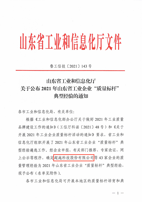 近日,山東省工信廳公布了2021年全省質量標桿名單,超越成功入選并位列榜首!