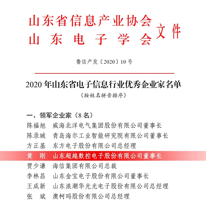 近日,2020年山東省電子信息行業優秀企業家名單正式公布,山東超越數控電子股份有限公司(下稱“超越”)董事長黃剛當選“領軍企業家”!